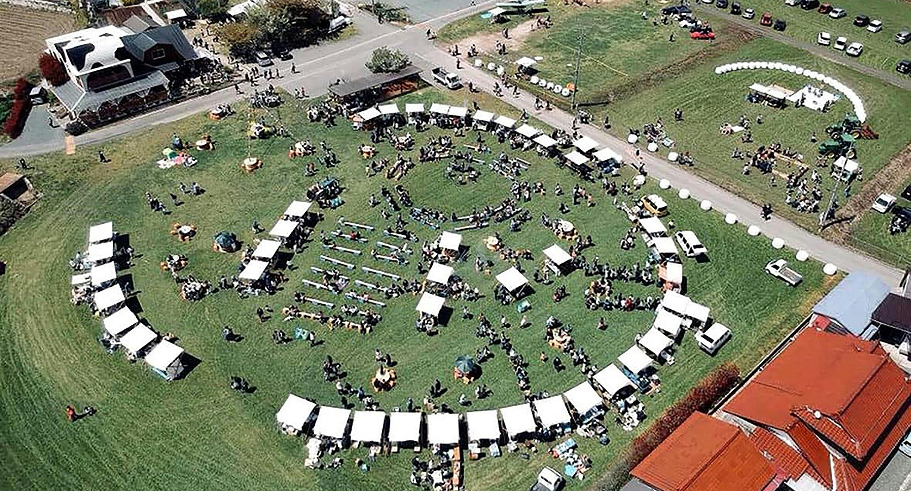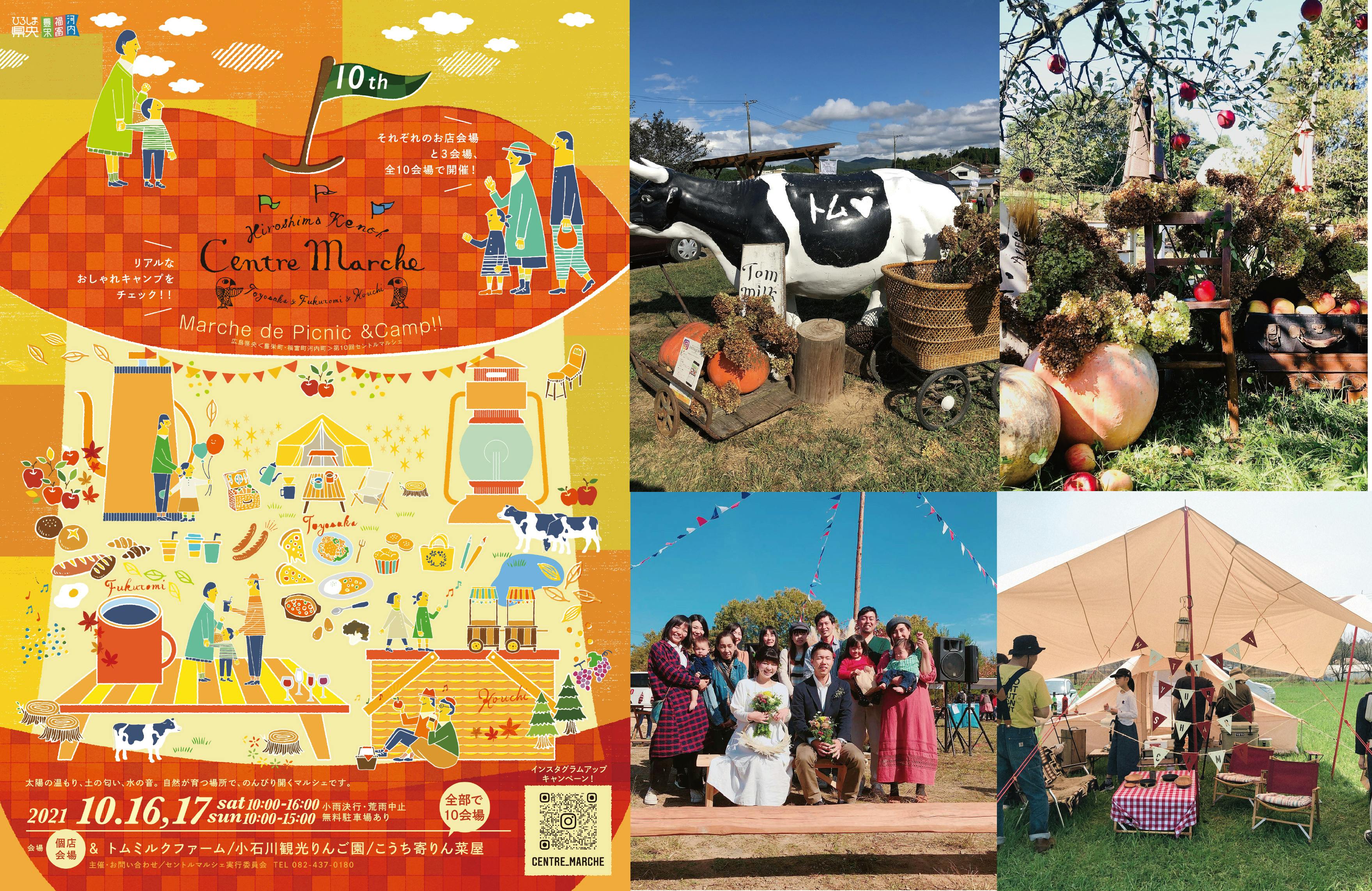 第10回セントルマルシェポスター。会場にインスタ映えスポットの設置。第7回はりんご園で結婚式のサプライズも。第8回は本格おしゃれキャンパーの出店など毎回趣向を凝らして開催。